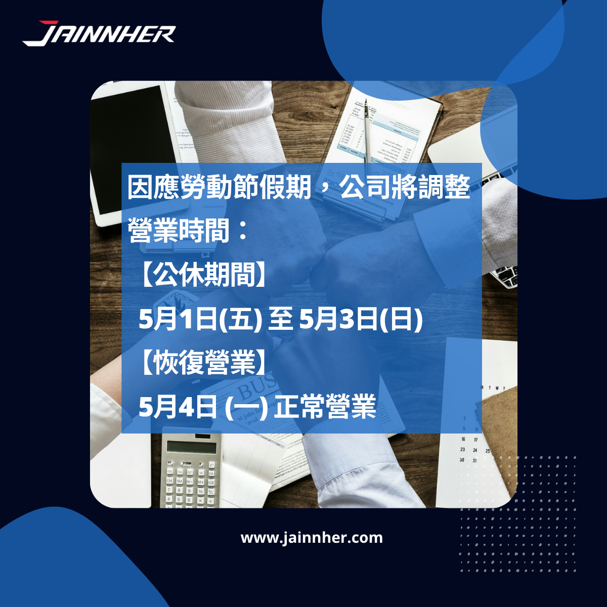 115年度 勞動節公休公告 Apr. 20 2026 訊息發佈 公司將於115年5月1日至5月3日暫停營業, 若您有需聯繫之事項,請點選此處留言。 感謝您的支持,造成不便,敬請見諒! 上一筆 返回 下一筆