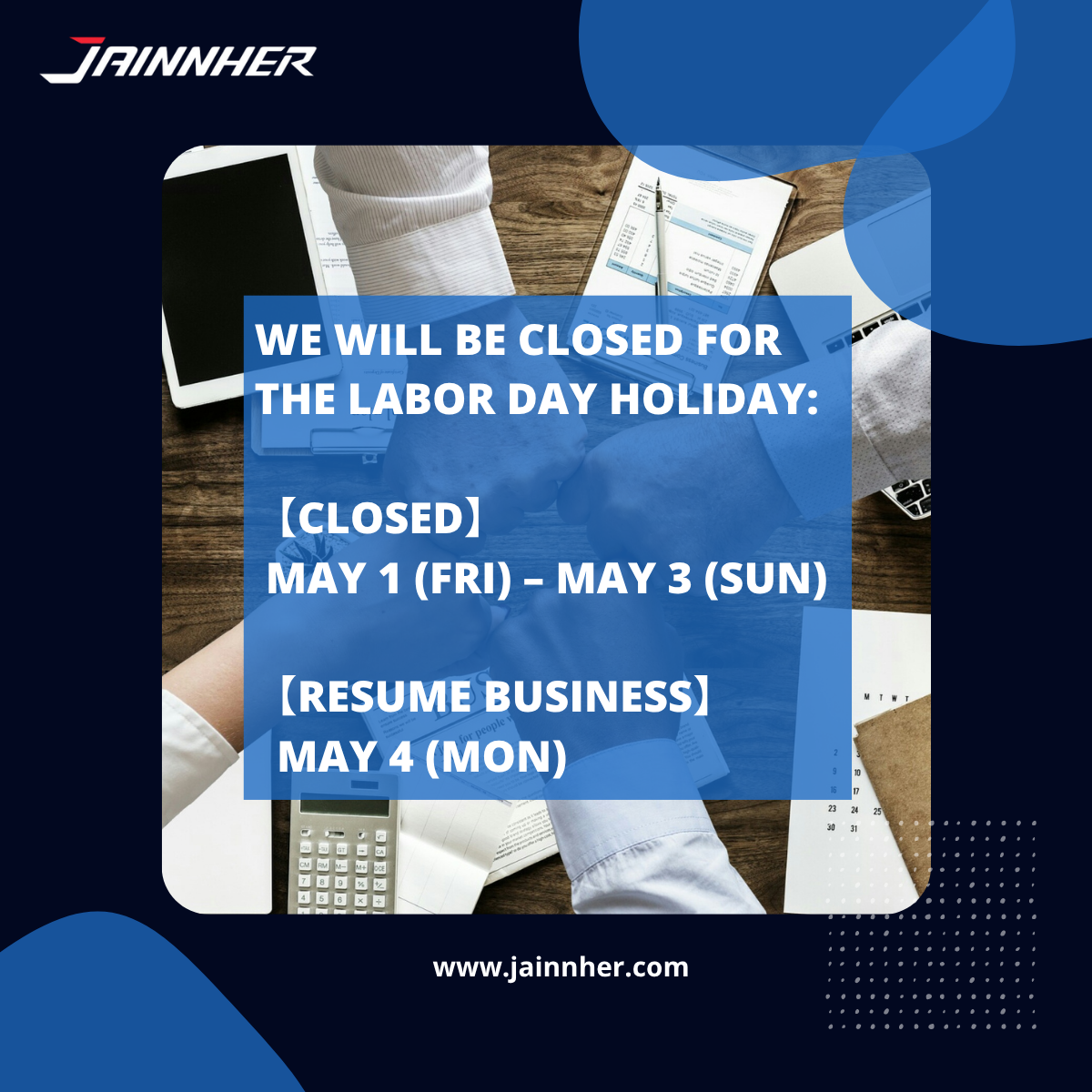 Our office will be closed from May 1 (Fri.) to May 3 (Mon.) for the Labor Day Holiday. Please click here to leave a message, and we will respond as soon as we resume work.